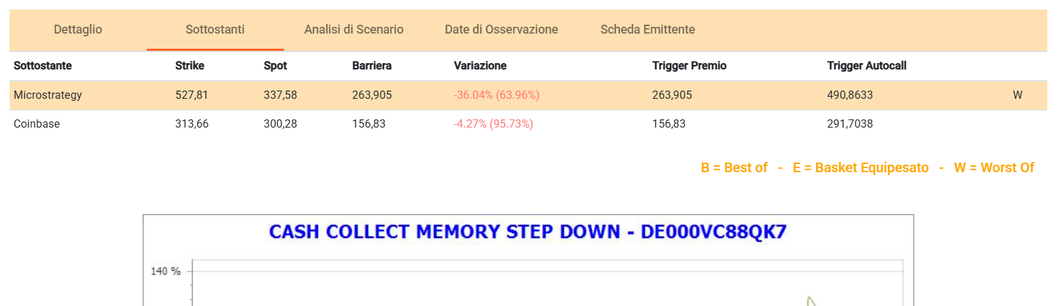 Prendiamo, ad esempio, il Vontobel DE000VC88QK7 Cash Collect Step Down su Coinbase e Microstrategy (WO a -36% da strike ma con ancora 22 punti sulla barriera capitale). Nasce con un payoff annuo del 36% (cedola mensile del 3%) frutto della volatilità dei due sottostanti:
