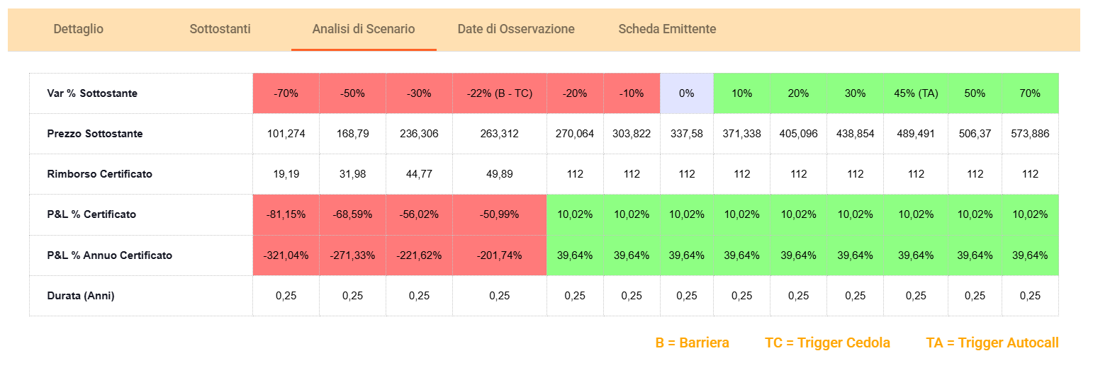Numeri diversi rispetto ai precedenti certificati, sempre abbastanza alti, ma non è quella l’origine del payoff attuale alto. Vediamo lo scenario: