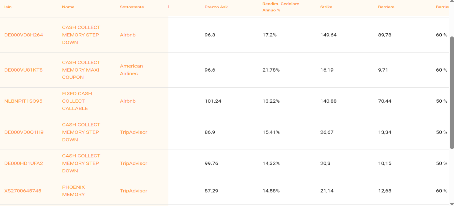 Per avere la platea più vasta possibile, sono andato a selezionare tutti i prodotti che hanno un payoff annuo maggiore del 14% pur avendo tutti i sottostanti sopra barriera almeno del 15%.