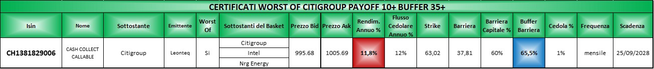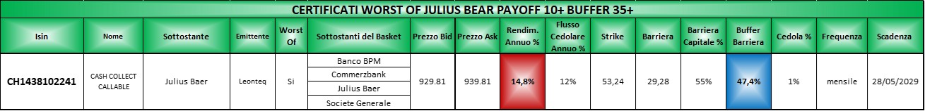 Si tratta di uno “stock picking” di settore per cui andremo a cercare tutti i certificati che hanno come worst of un sottostante del settore ma anche con determinate caratteristiche di buffer capitale e payoff annuo.