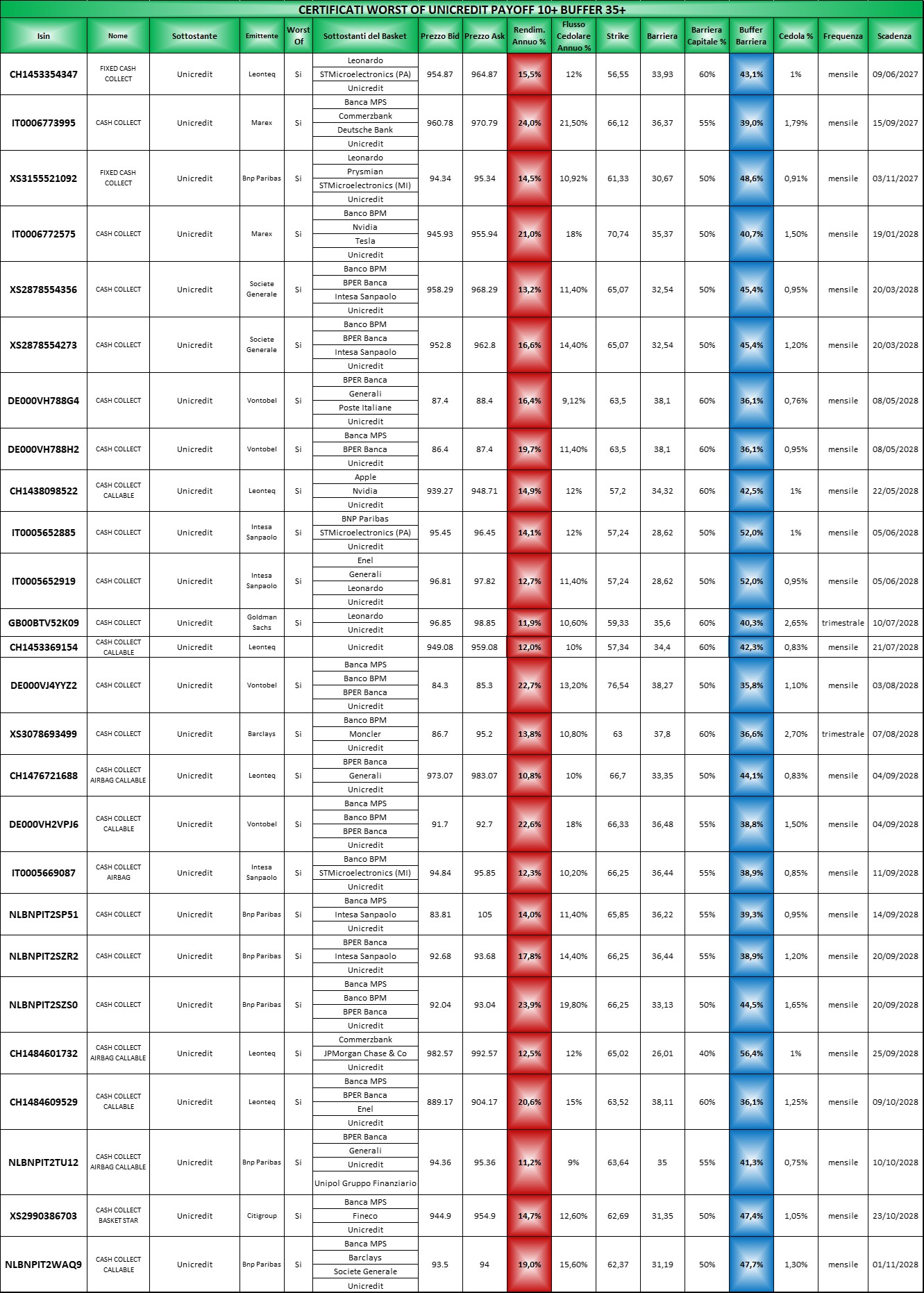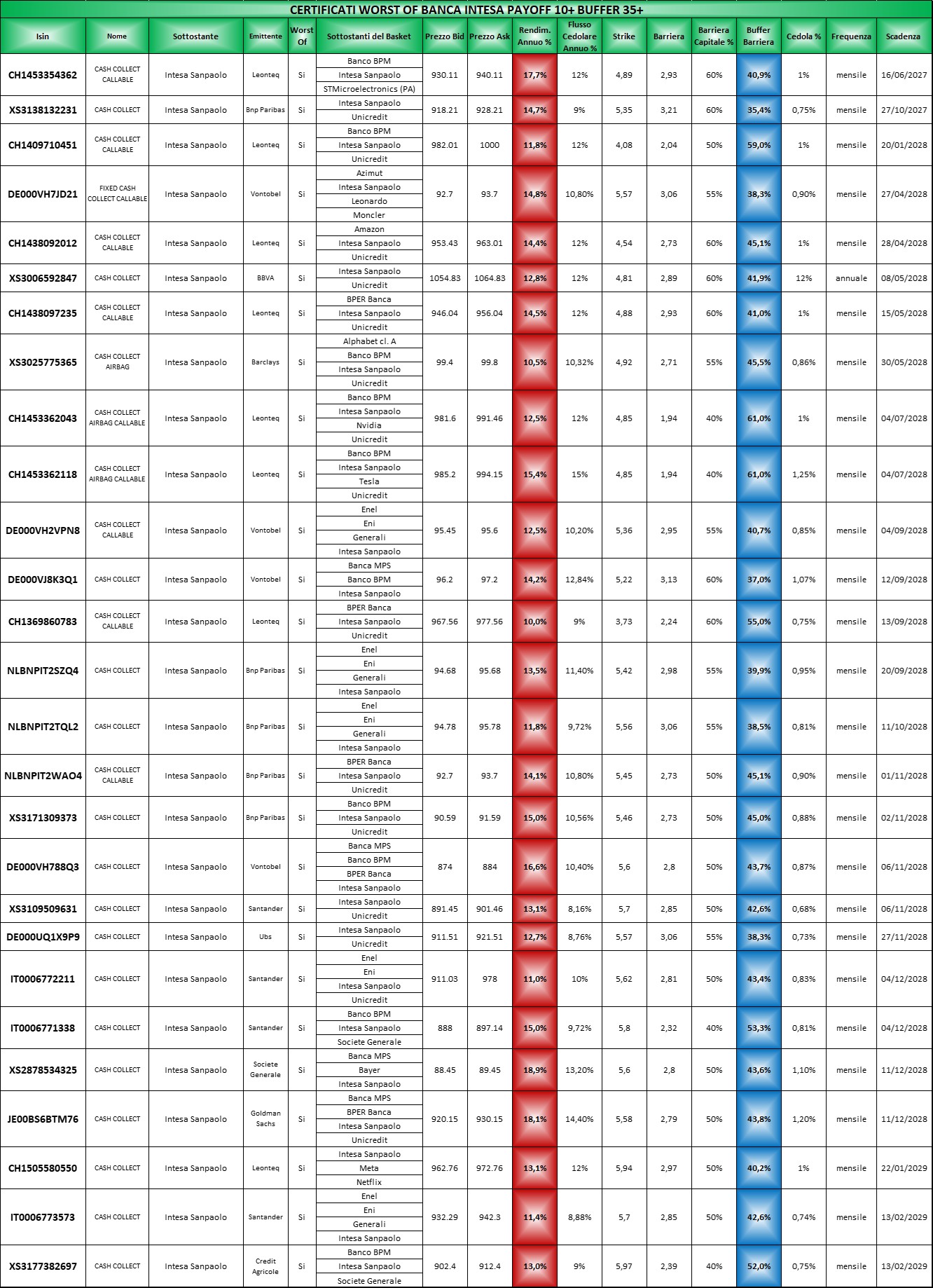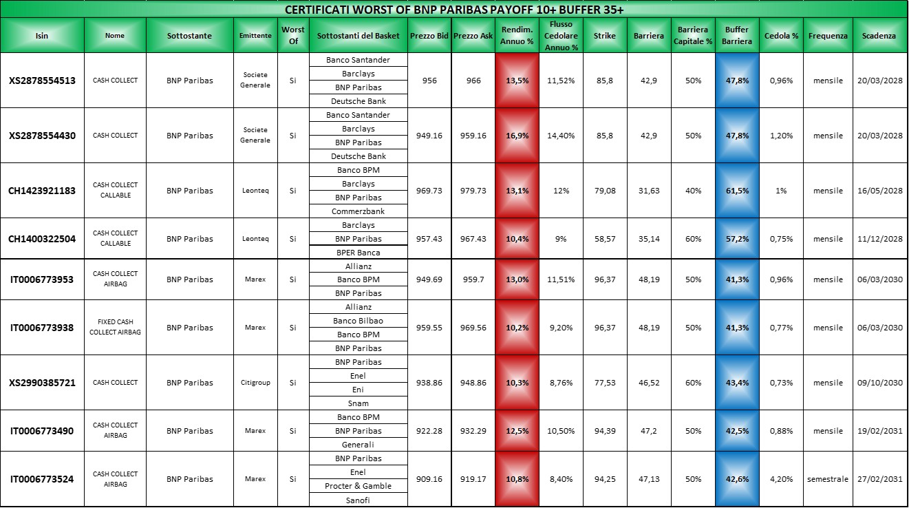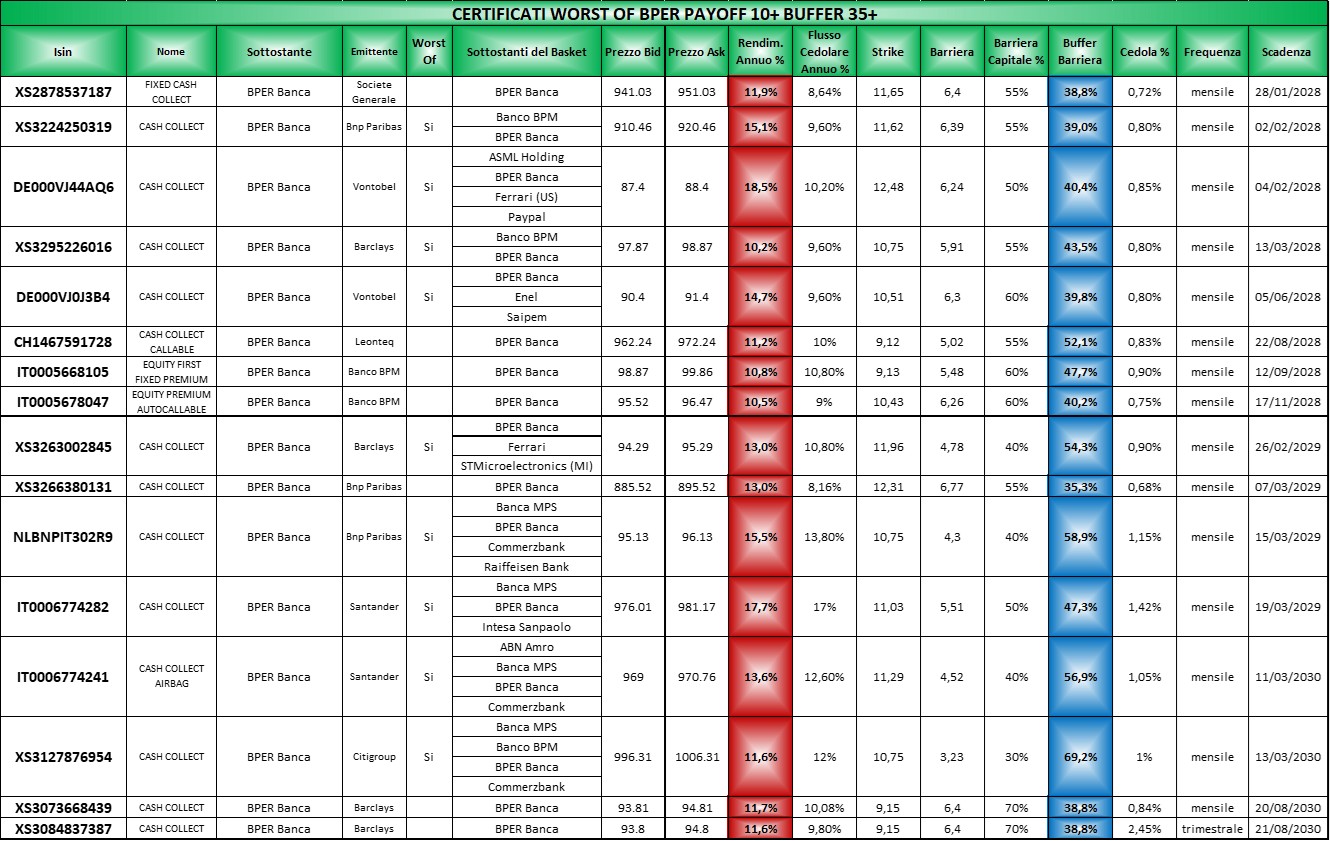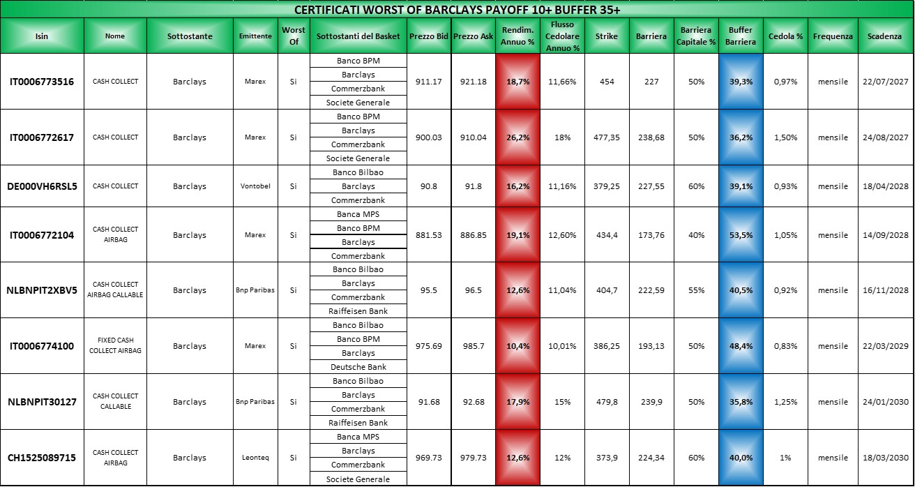 Le tabelle complete per il settore Banche segmentate per buffer le potete trovare Qui (file Excel) in cui come sempre i certificati sono elencati per scadenza crescente, con il buffer barriera in blu e il rendimento annuo in rosso ricalcolato sulla base dell’ask di venerdi 20 marzo 2026 mentre le tabelle segmentate per sottostante le troverete Qui (file Excel)organizzate con la solita logica.