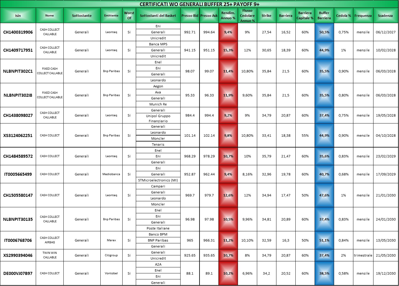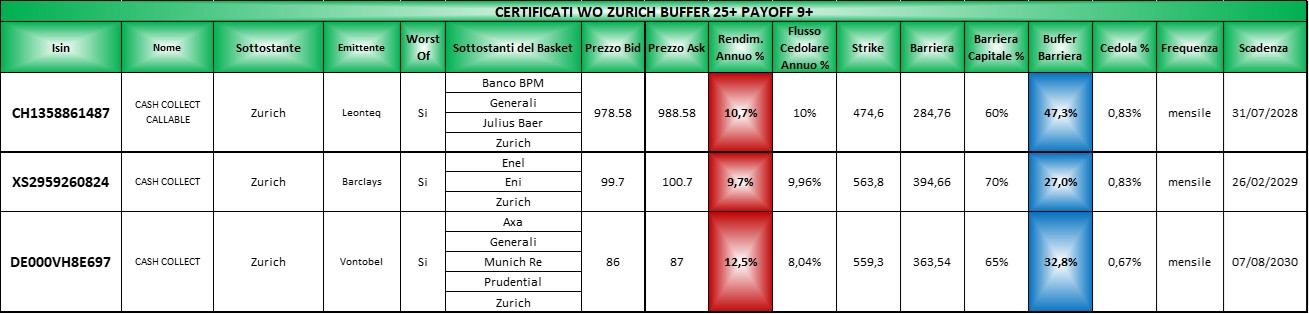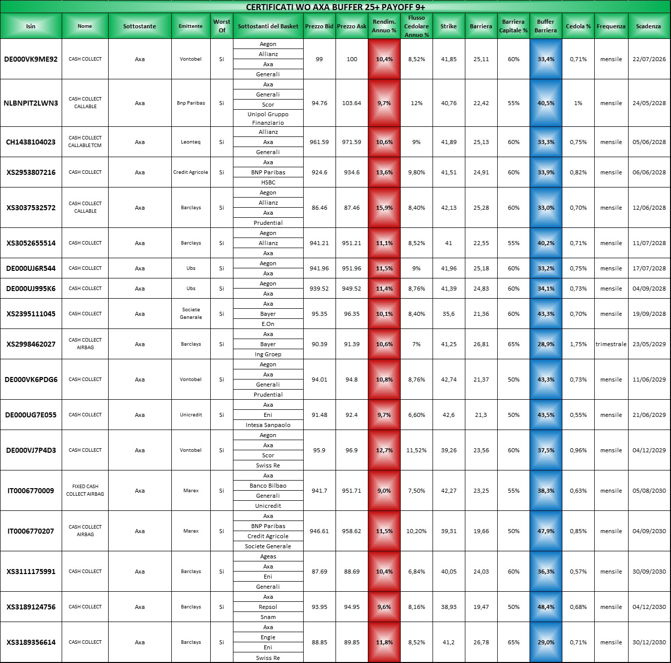 Le tabelle complete per il settore Assicurazioni le potete trovare Qui (file Excel) in cui come sempre i certificati sono elencati per scadenza crescente, con il buffer barriera in blu e il rendimento annuo in rosso ricalcolato sulla base dell’ask di venerdi 20 marzo 2026.