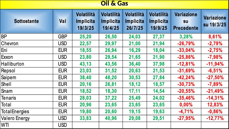 Come si vede dalla tabella volatilità Oil & Gas e Energy in netto calo rispetto al 19/4/25 (dichiarazione dazi da parte dell’amministrazione USA) e in leggero aumento rispetto al 26/7/25.