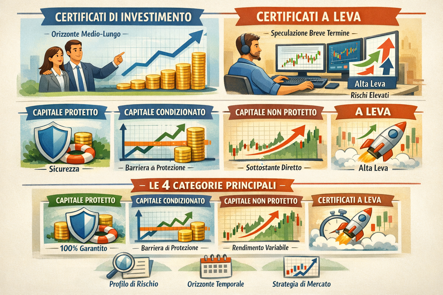 Gli Investment Certificates sono progettati per investimenti di capitale con orizzonte medio-lungo e vari gradi di protezione. I Leverage Certificates sono strumenti speculativi con leva finanziaria, adatti a trading di breve termine o copertura. I primi hanno strutture opzionali complesse, i secondi amplificano linearmente i movimenti del sottostante.